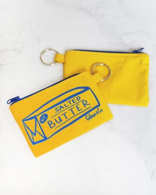 Bright yellow fabric with bright blue screen print and zipper. Colorful zipper card pouch is 100% cotton, screen printed, with contrast zipper and keyring. Approx. 5"w x 3.12"hRegular price $15.00Quick view -