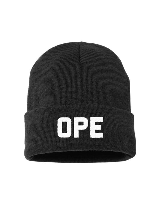 Warm up the noggin' in this 3-season trendsetter. (Year-round to you, UP and MN) This black knit beanie features a white "OPE" on the front. Embroidered 100% acrylic knit beanie, Made in USA of imported yarn. Care: Machine wash...Regular price $22.00Quick view -