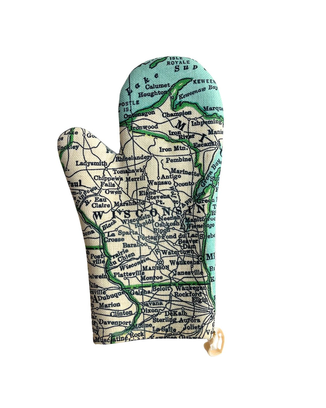 Perfect for using at the grill or in the kitchen, this oven mitt is made from heat resistant material, but still has a soft, cottonlike feel. A map is featured on one side, with silver quilting on the back, with a loop for hanging. And wait until you feel the softness inside this oven mitt! This listing is for one right-handed oven mitt.