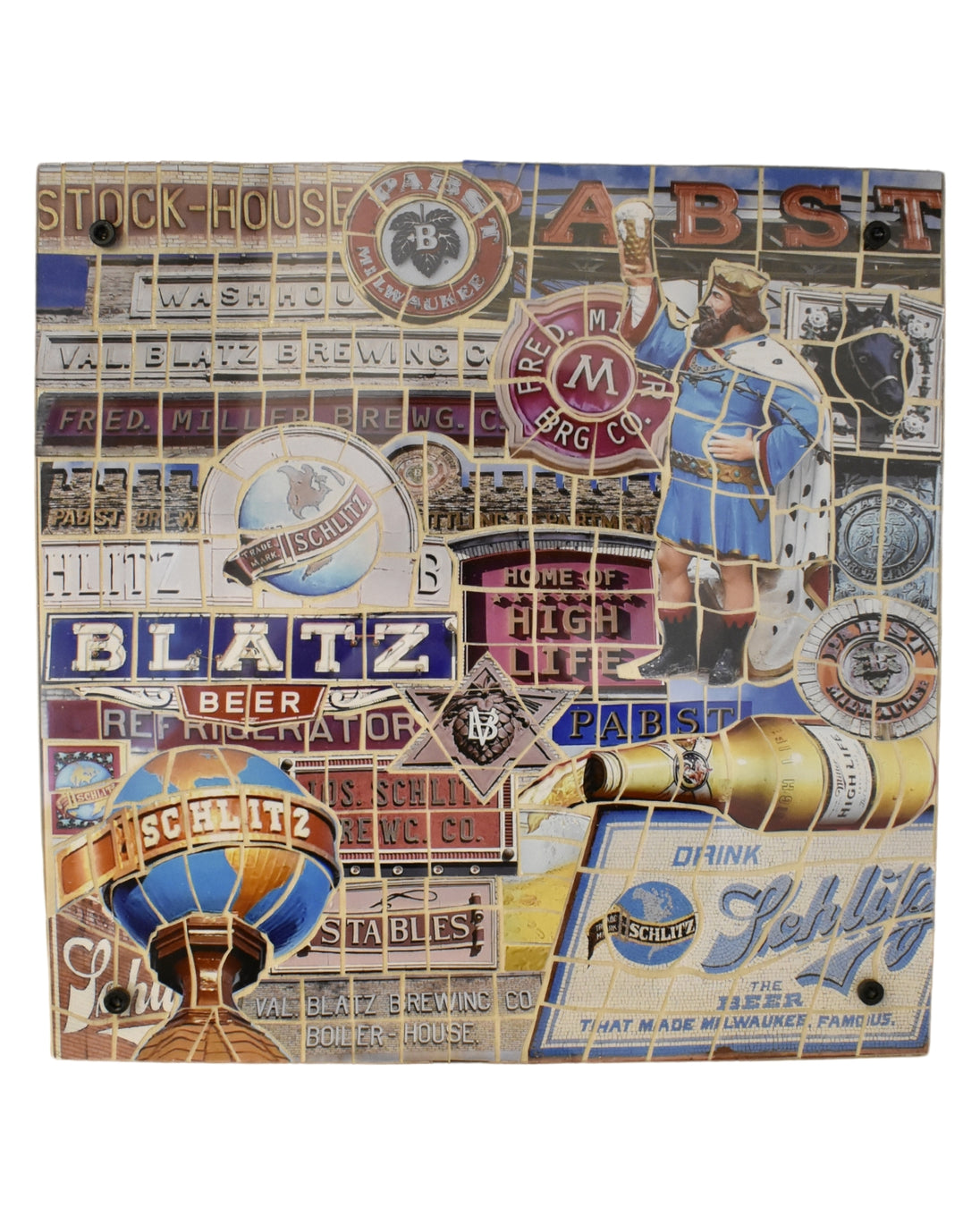 This is a 12" x 12" montage of Milwaukee images, consisting of photographs cut into pieces and assembled as a mosaic. It is mounted on wood and framed in plexiglass. It contains dozens of Milwaukee images, some familiar to any local and some more obscure. How many can you identify? Designed and made by local artist, Dave Cory.