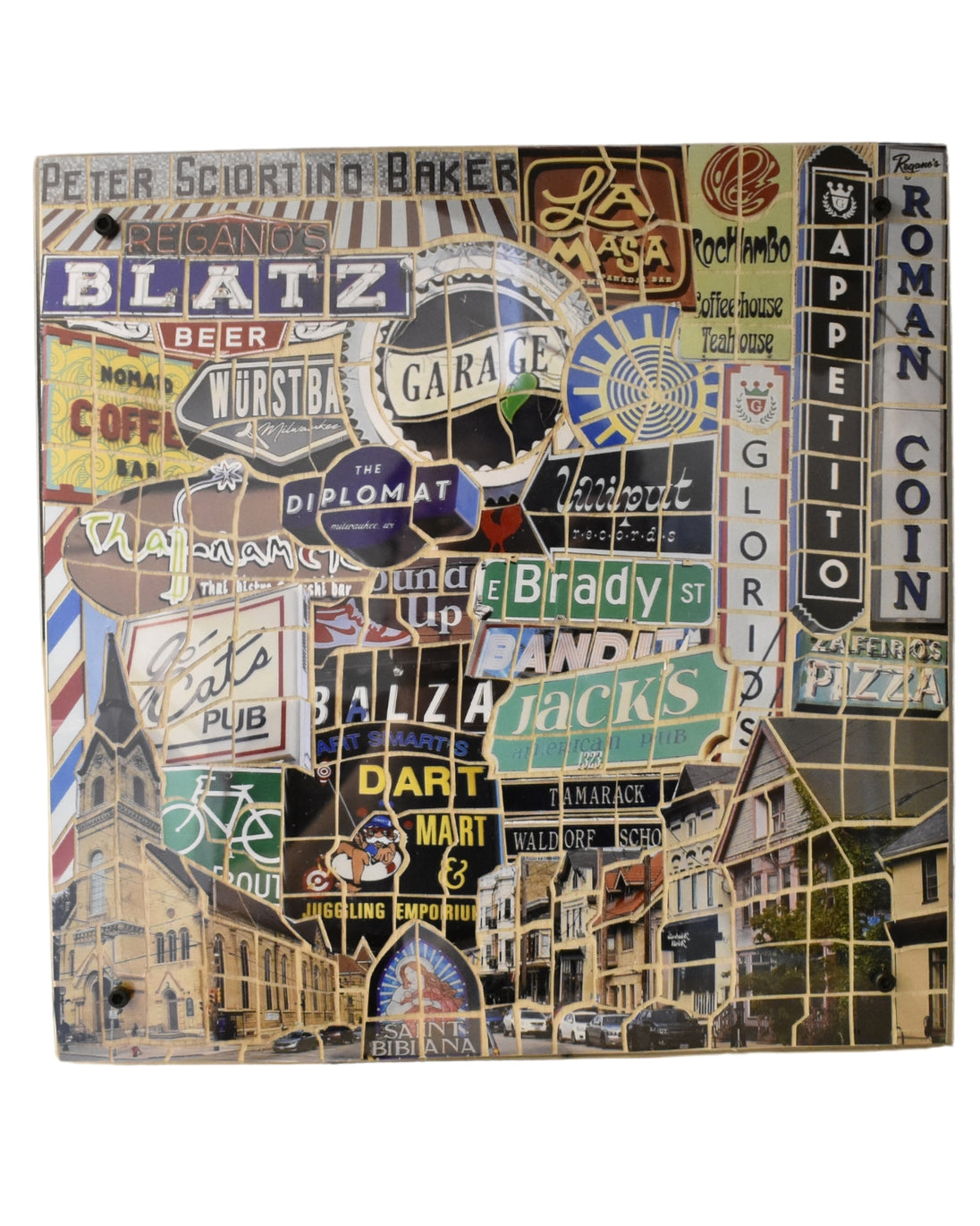 This is a 12" x 12" montage of Milwaukee images, consisting of photographs cut into pieces and assembled as a mosaic. It is mounted on wood and framed in plexiglass. It contains dozens of Milwaukee images, some familiar to any local and some more obscure. How many can you identify? Designed and made by local artist, Dave Cory.