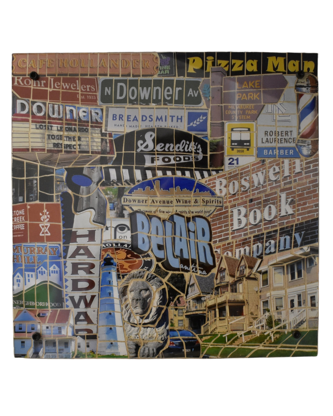 This is a 12" x 12" montage of Milwaukee images, consisting of photographs cut into pieces and assembled as a mosaic. It is mounted on wood and framed in plexiglass. It contains dozens of Milwaukee images, some familiar to any local and some more obscure. How many can you identify? Designed and made by local artist, Dave Cory.