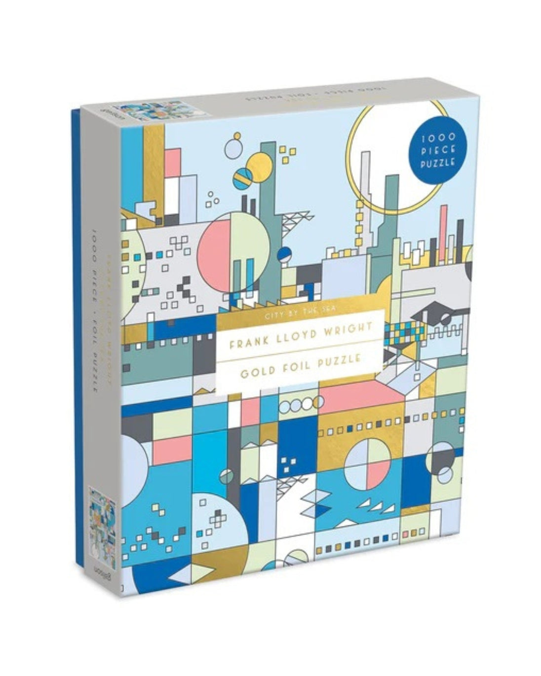 The FLW City by the Sea 1000 Piece Foil Puzzle introduces a new flavor to an iconic series of art. The foil combined with Wright's striking image will bring joy and relaxation to amateur and pro puzzlers alike. - 1000 pieces with foil accents - Box Size: 8.4 x 11.4 x 1.7" - Puzzle Size: 27" x 20"