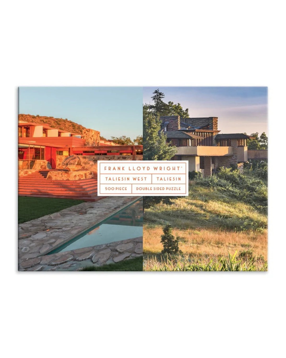 Frank Lloyd Wright is recognized worldwide as one of the greatest architects of the twentieth century. His work heralded a new thinking in architecture, using innovation in design and engineering made possible by newly developed technology and materials. His creative ability extended far beyond the border of architecture to graphic design, furniture design, art glass, textiles, and decorative elements for the home. Stunning photos of both Taliesin and Taliesin West grace each side of this 500 piece double-sided puzzle. One side is matte and the other is glossy for easy sorting. Puzzle Size: 24" x 18"