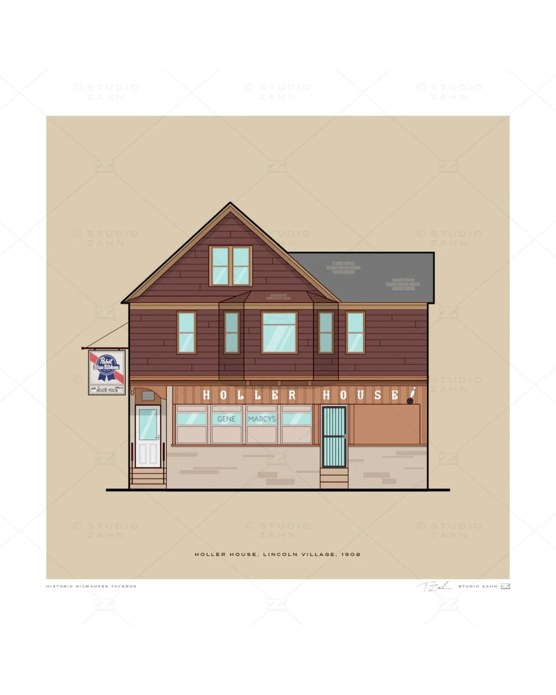 Art print of the legendary Holler House, dating to 1908, featuring the oldest ten pin bowling alley in America.