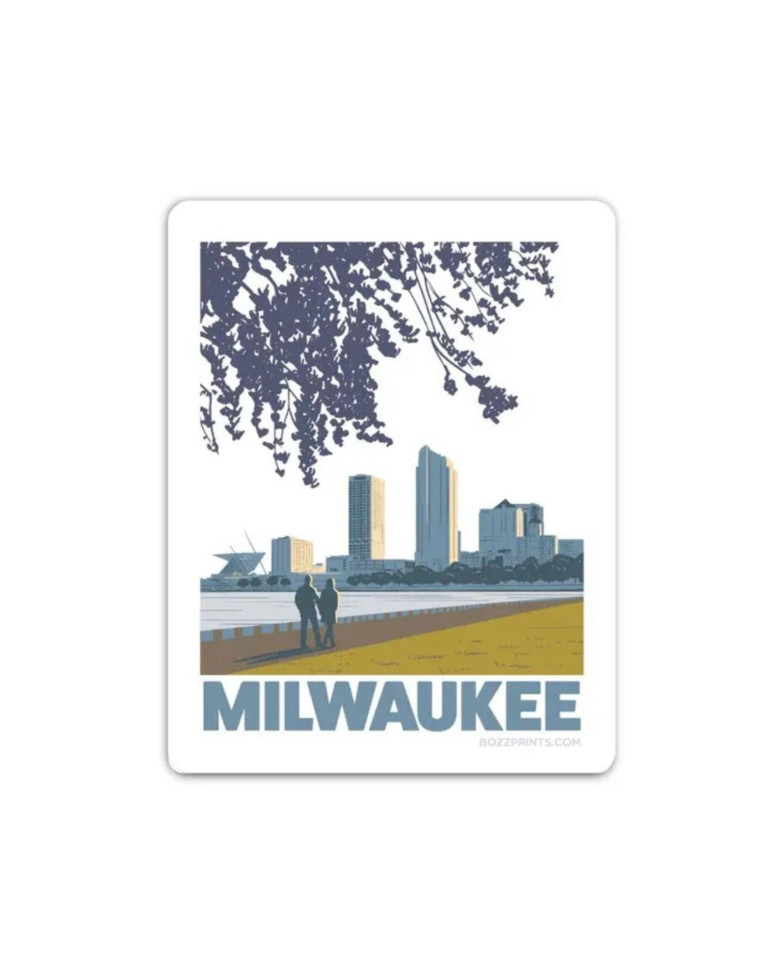 Die-cut vinyl sticker featuring Milwaukee's Lakefront Skyline. UV laminate protects from scratching, rain, and sunlight. Approximately 3.5" x 3"