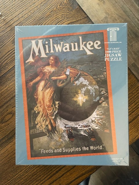 The phrase, "Milwaukee Feeds and Supplies the World," was first used in 1898. The slogan and this image first appeared on the cover of The Book of Milwaukee: Development, Resources, Enterprise and Beauty of the Peerless Cream City. The book was intended to boost Milwaukee's profile and was published in 1901 by The Evening Wisconsin, the highest circulating afternoon newspaper in the City in the early 1900s. The image was revived in the 1980s by the City of Milwaukee Department of Development who created a poster reproduction to accompany the newly minted neighborhood posters. Many wonder who the illustrator or lithographer of this popular image might be but no definitive answer has ever been found. The Milwaukee Public Library lists at least ten possible lithography companies working in Milwaukee when the image was produced. Puzzle information: 1000 pieces 19.25" x 26.625" when completed