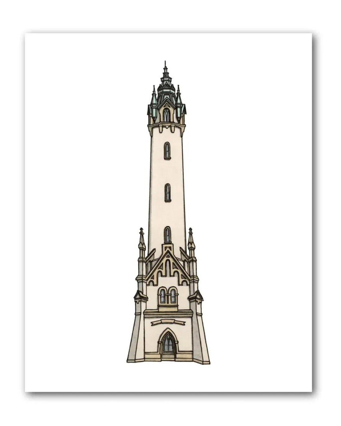 Built using Milwaukee's famous cream city brick and limestone, this structure has stood since 1874. It no longer functions as a water tower today, merely providing people an excellent look into Milwaukee's Victorian Gothic past. Show your Milwaukee pride by hanging this art in your home, wherever in the country that may be!