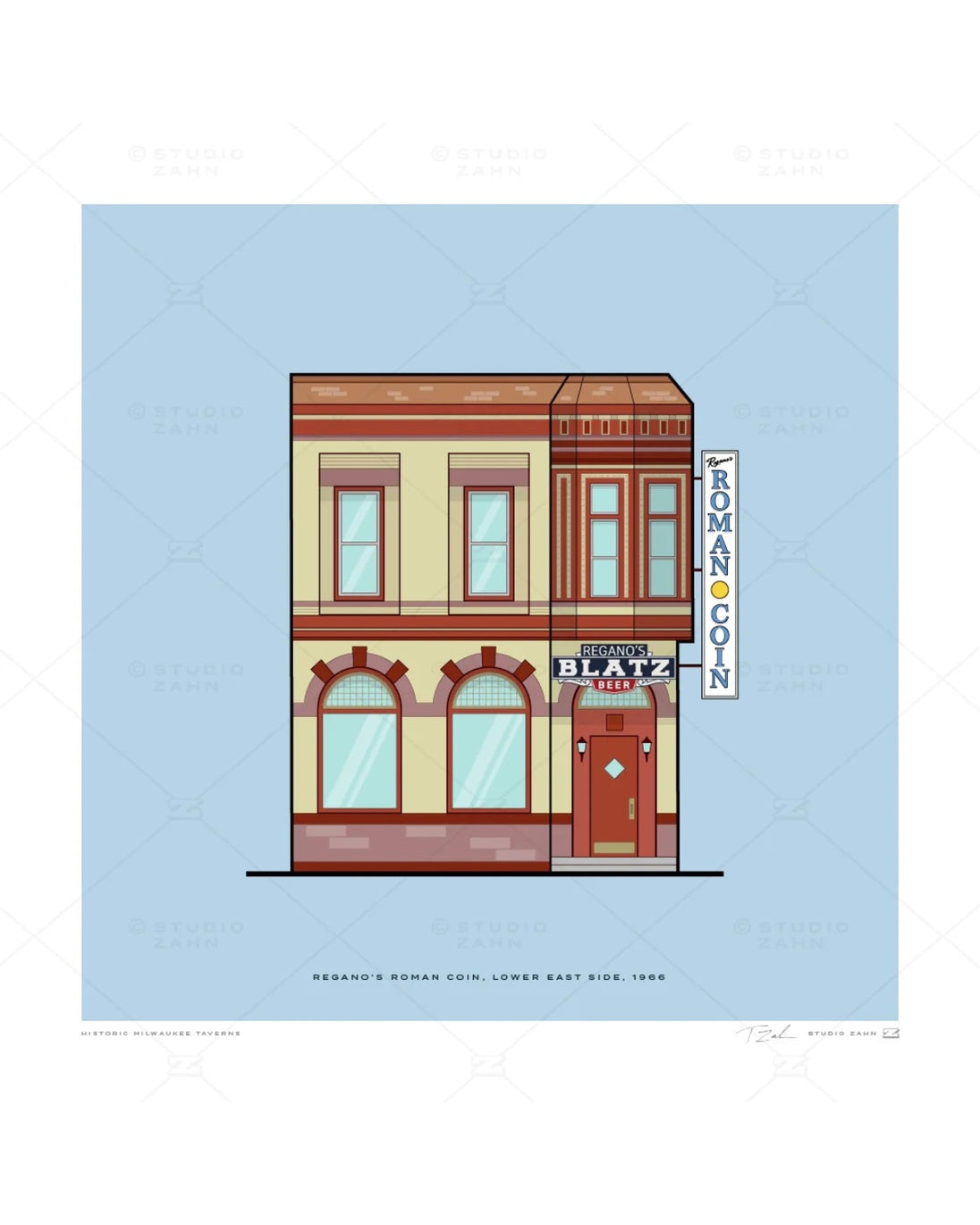 Art print of Regano’s Roman Coin, the Brady Street icon run by the Regano family since 1966. The ornate building itself dates to the 1890s, when it opened as the Pabst Saloon.