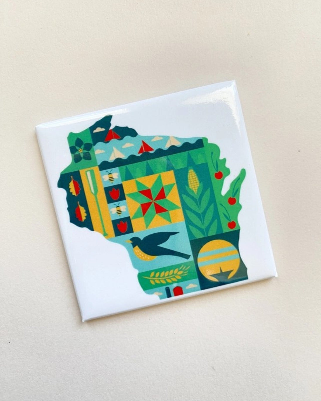 “WI” souvenir, local love magnet featuring a fun quilted graphic pattern of all things WI! Magnets have a gloss finish with a hard magnet backing. Magnet size: 2.5" x 2.5"