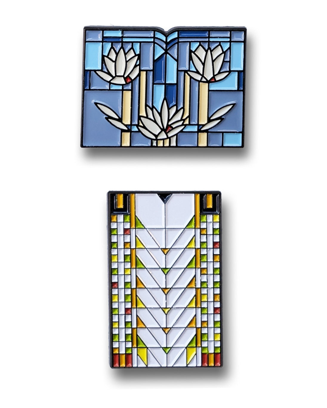Frank Lloyd Wright Enamel Pins offered in two designs: Waterlilies & Tree of Life