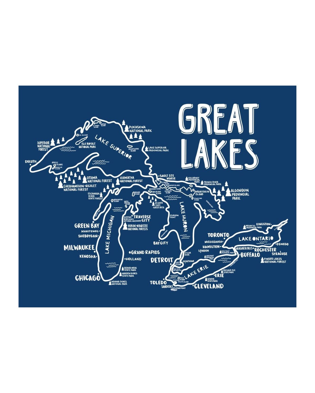 These giclee prints feature an original hand drawn map of the Great Lakes region done by artist Katie Ford, Whereabouts Shop. Giclee prints are on archival matte paper, and they are UV resistant.