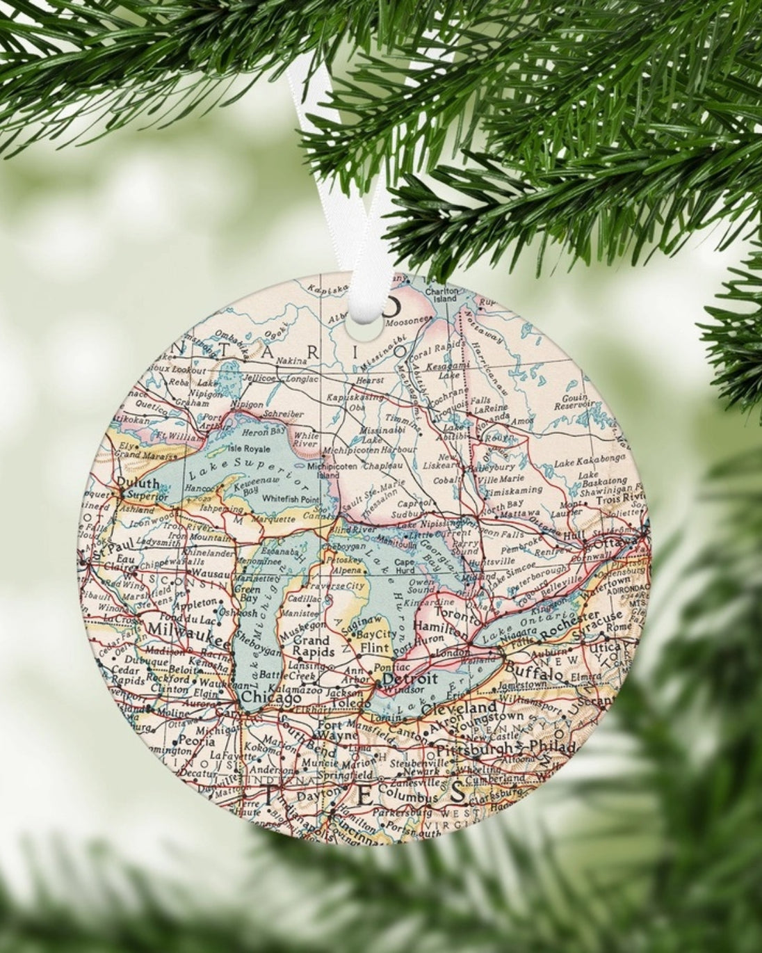 This map ornament features a map of the Great Lakes. This ornament is approximately 3" diameter one-sided semi-gloss aluminum. A ribbon is included.