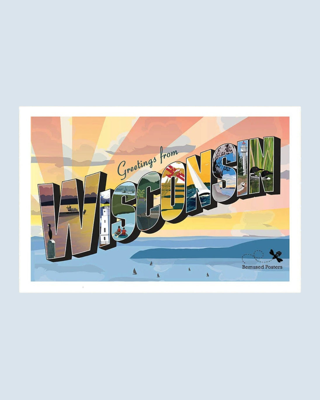 Vintage-inspired Wisconsin design featuring vignettes of other Wisconsin designs.