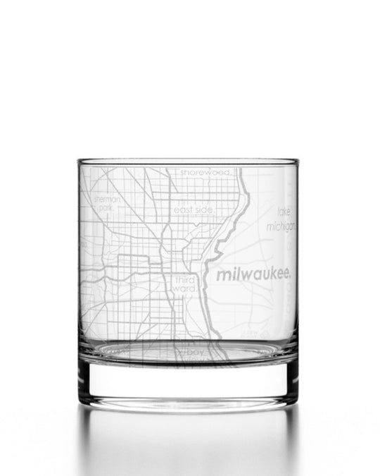 Rocks glass made by Well Told featuring etchings of Milwaukee streets and neighborhoods. Dishwasher safe.Regular price From $18.00Quick view -