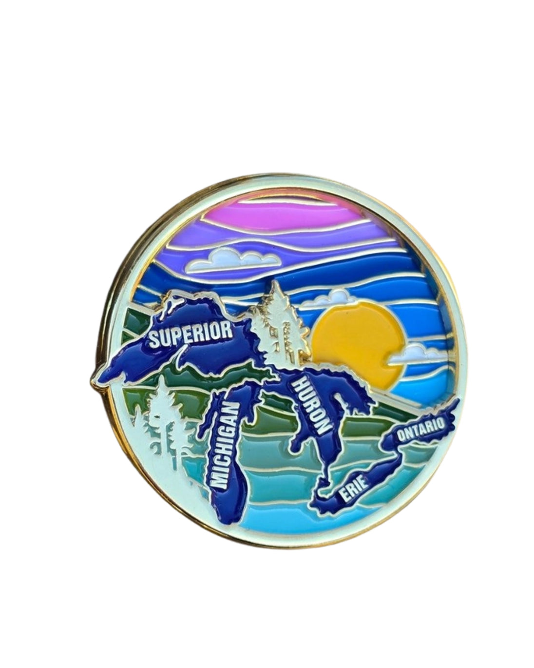 This exquisite gold tone enamel pin features a beautifully colorful design representing the Great Lakes and is uniquely crafted to spin. One half showcases a vibrant sunrise scene with the sun peeking through clouds, creating a warm and inviting atmosphere. The other half captures the mesmerizing Northern Lights dancing above the waves, evoking a sense of tranquility and wonder. The spinning feature adds a dynamic element, while the intricate details highlight the names of the lakes, making it a perfect tribute to this stunning region.