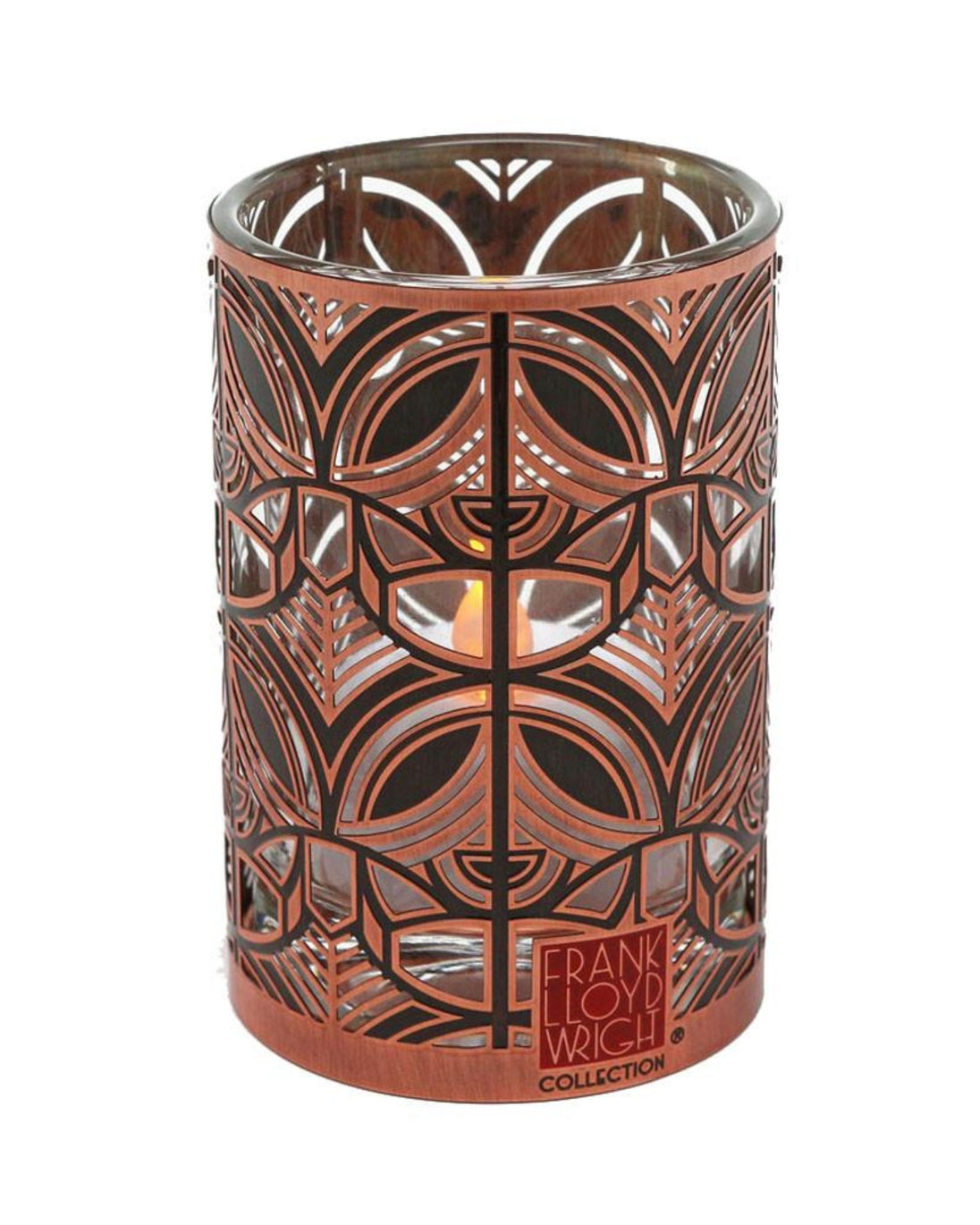 Frank Lloyd Wright Annunciation Greek Orthodox Church design metal votive, 3.3" tall by 2.4" diameter. Includes a glass votive holder and battery operated flameless tea light.