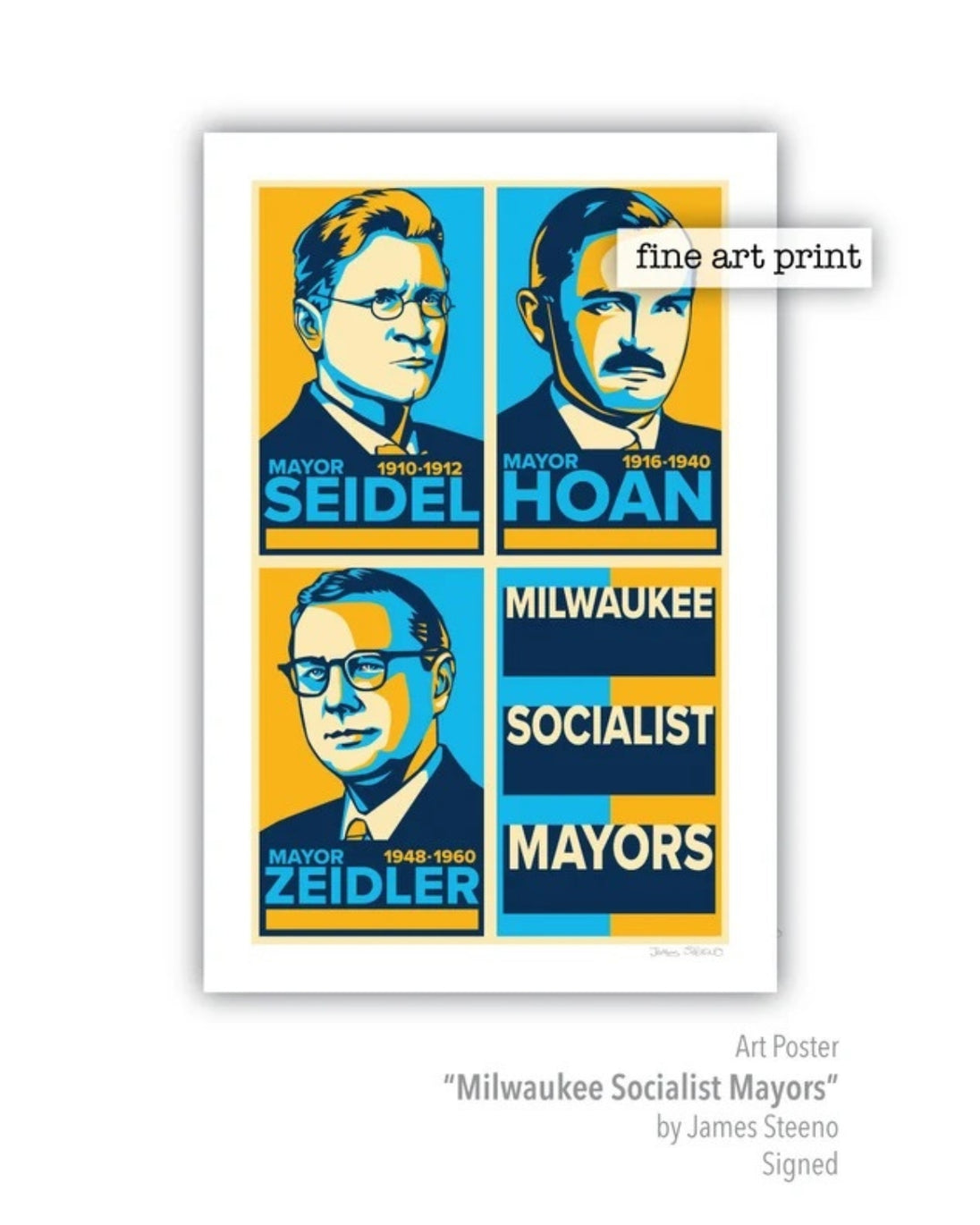 12”x 18” poster featuring Milwaukee's three Socialist Mayors: Mayor Seidel (1910-1912), Mayor Hoan (1916-1940), Mayor Zeidler (1948-1960)
